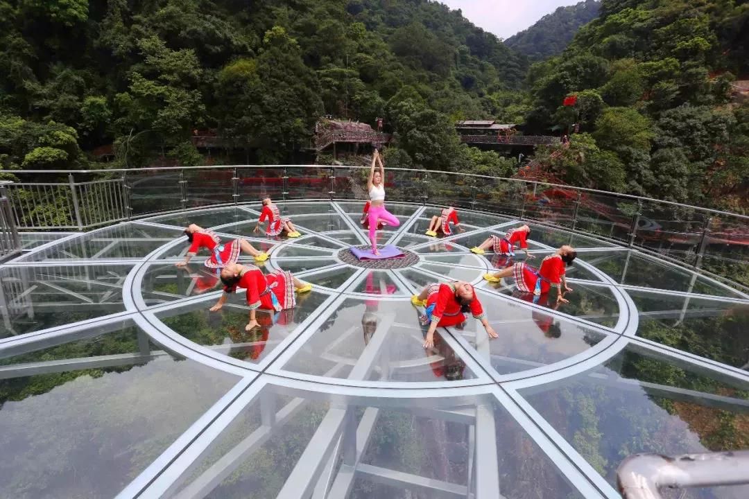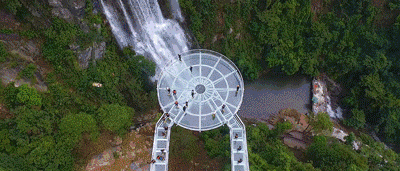 懸空玻璃平臺全長202米,以72米的懸空跨度名列世界第一,為美國科羅拉多大峽谷的U形橋(21米)的3.5倍;點睛之筆是平臺頂部直徑16.8米的玻璃觀景圓臺,這是和瀑布親密接觸的絕佳位置。圓臺中間獨具匠心地設(shè)計了網(wǎng)格狀鏤空,山風(fēng)穿透,頓生寒意;踏步其上,如墜深淵,令人心驚膽寒。