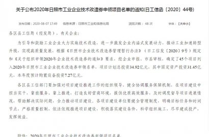 根據(jù)《日照市企業(yè)技術(shù)改造券管理暫行辦法》(日工信發(fā)〔2020〕9號(hào))規(guī)定和《關(guān)于組織申領(lǐng)2020年企業(yè)技術(shù)改造券的通知》要求,經(jīng)積極申報(bào),通過(guò)市工業(yè)和信息化局審核,成功申領(lǐng)2020年日照市工業(yè)企業(yè)技術(shù)改造券。